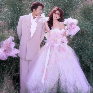 在服装的颜色搭配上,白色、粉色、柠檬黄、天蓝、草绿等更鲜亮、明丽、活泼的色调,可以突出新娘清新甜美的气质,展现青春活力,突出甜蜜的爱情气息,也让整体造型看起来更加年轻时尚。
