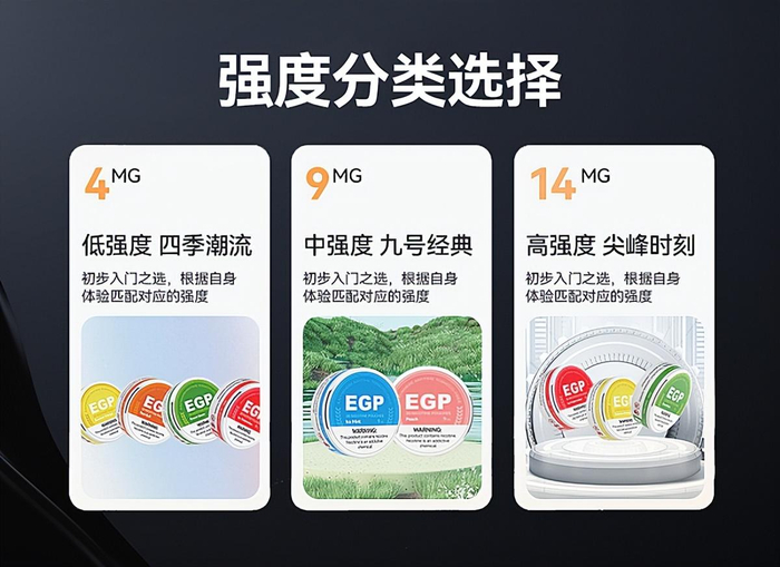 按成分含量强度来分可以分为低强度-四季潮流4MG 中强度-9号经典 9mg 高强度-尖峰时刻14mg。不同强度的产品匹配不同消费人群,消费者自己可以选择对应的强度。按口味来分,选用消费者常见的容易接受10种不同口味。