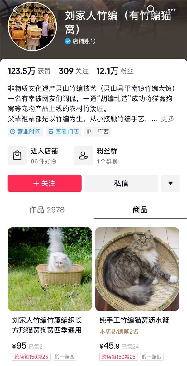 2020年,刘霞冰注册抖音号@刘家人竹编,在网友们的集思广益之下,打造出了“爆款”竹编猫窝,非遗的“老手艺”就此融入了高溢价的宠物赛道。如今,刘霞冰的抖音电商年销售额相比开始已经翻了6倍有余,600多位非遗工匠也因此就业增收,焕发新生。