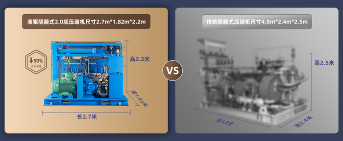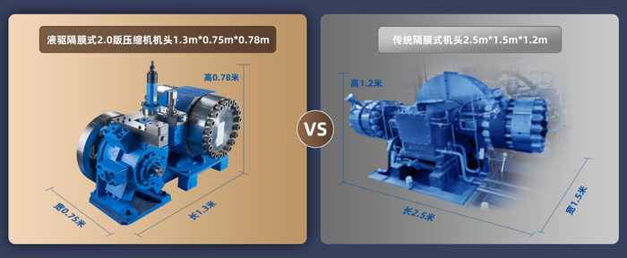 二代产品通过对膜头组件的进一步优化,将双侧油侧膜头合二为一,机头尺寸缩小到仅1.3mx0.75mx0.78m(长宽高),体积较一代机头减少近50%,减少到传统隔膜式机头的20%以下; 重量仅1.6吨。极致的小型轻量化不仅取得了提升液压系统容积效率、提升整机刚度实现减振、有效降低制造成本等多重收益,还使内部维修空间进一步增加,提高了可维修性,也使液驱隔膜式压缩机能够适配未来更加灵活的氢能应用场景,在制加氢一体站、综合能源站等场景下应用具有显著的优势。