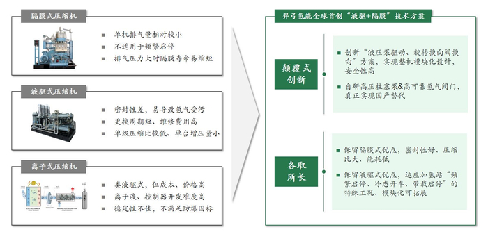 综上,现有各类站用氢气压缩机各有优劣,但短时间内无法满足高压、大排量、国产化的发展需求。同时,加氢站投建、运营方对于氢气压缩机安全性、可靠性、操作及运维便利性、全生命周期经济性等方面的需求尚未得到充分满足,市场亟待一种兼顾传统隔膜式、液驱式优势的“兼美”型产品出现。