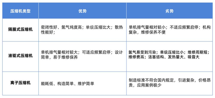 4.排量存在瓶颈,高压技术成熟度不高。目前国内加氢站建设仍以面向商用车为主,应用比较多的还是45MPa-500kg压缩机,但加氢站对于高压力、大流量的未来需求趋势已经非常明显。在同样的储氢容积下,高压力意味着车辆有更长的续航里程和更优的经济性,数据显示,70MPa氢气比35MPa要多出67%的续航里程。在高压领域,国产化隔膜压缩机技术成熟度和竞争力较差,国外技术成熟度相对较高,国内有成熟应用的90MPa高压氢气压缩机尚不多见。同时,随着氢能商用车渐成规模,加氢站在有限的建设用地上满足大规模车队加注,最佳路径就是增大压缩机的排量。由于加氢站的上述发展趋势,意味高压、大排量将是市场用户对站用压缩机的重要需求。