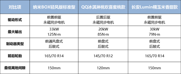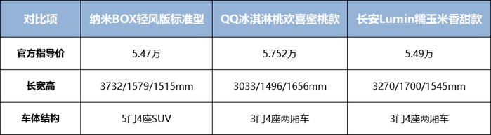今天,我们选择入门级纯电代步车市场上的三款热销车型进行对比,它们分别是纳米BOX轻风版标准型(下称纳米BOX)、QQ冰淇淋桃欢喜蜜桃款(下称QQ冰淇淋)和长安Lumin糯玉米香甜款(下称长安糯玉米)。来一起看看哪款更适合你吧?