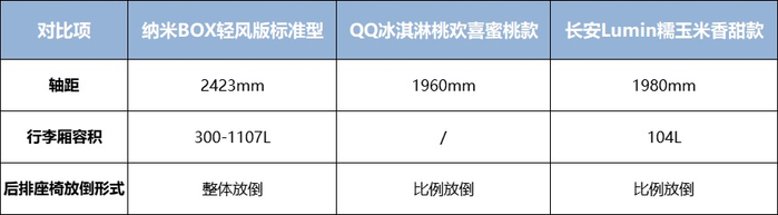 总体来说,如果把三款车型的内部空间比作房子,QQ冰淇淋和长安糯玉米就是一间80、90平的小三房,纳米BOX则是120平的大三房,空间宽敞度和舒适性要更优秀。