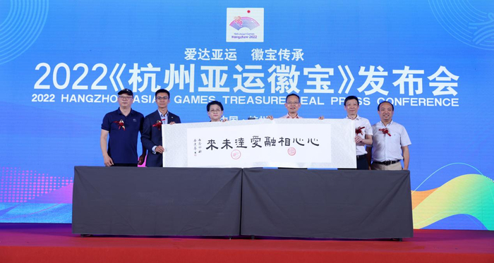 发布会现场,与会领导和嘉宾共同揭开《杭州亚运徽宝》原玺的神秘面纱,并在桑建华老师的书法作品上盖下了杭州亚运会会徽底印和杭州亚运会会名篆刻底印,原玺现场赠送给杭州亚运博物馆永久馆藏,成为亚运历史文化遗产,代代相传。