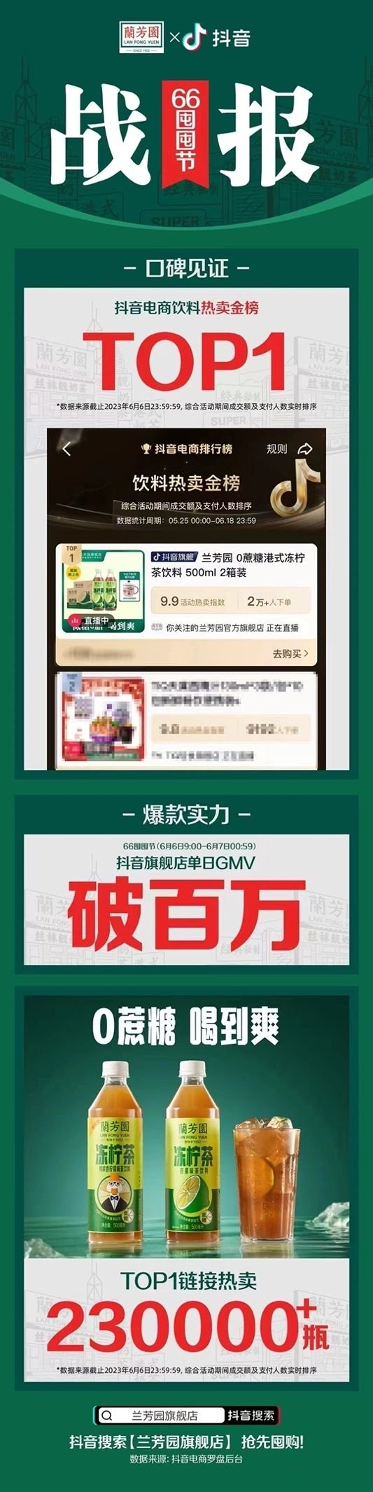 而在刚刚结束的抖音&兰芳园“66囤货节“上,兰芳园抖音旗舰店单日销售额破百万,冻柠茶销量则达23万瓶,登上抖音电商饮料热卖金榜首位。