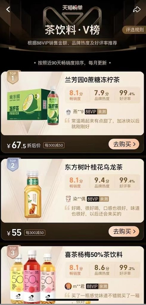 口味更正宗、口感更独特,兰芳园冻柠茶自上市以来,就好评不断,销量不断攀升。产品上市首月,就在天猫超市获得了销售额破百万的好成绩。新品试销阶段,接连登上抖音柠檬茶TOP 1和天猫茶饮料·V榜TOP 1等热卖榜单,老顾客的复购率高达40%。