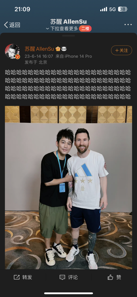 而整场直播最大的“获益者”,竟是娱乐圈知名的“梅粉”歌手苏醒。直播刚结束不久,一条名为“梅西苏醒合影”的热搜直接冲击榜一,成为今天热搜榜最大的黑马,为此,苏醒特意使用了88个“哈”字来表达自己的兴奋。网友表示:“入职遥望就能追星成功,我现在就发简历!”