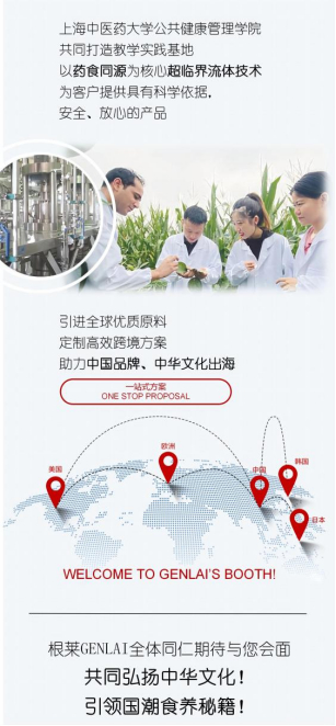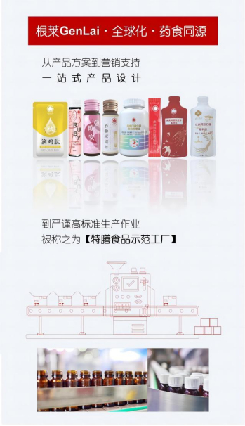 根莱GenLai产品线覆盖抗衰逆龄、心脑血管、护肝养肾等各个类目,拥有亚临界萃取技术、生物合成萃取、超临界流体技术、分子蒸馏技术、模拟移动床分离技术,将营养成分充分保留。从产品方案到营销支持等一站式产品设计服务,到严谨高标准生产作业并被称之为特膳食品示范工厂。今年更是与上海中医药大学公共健康管理学院共同打造教学实践基地,以药食同源为核心超临界流体技术,为客户提供具有科学依据、安全、放心的产品。