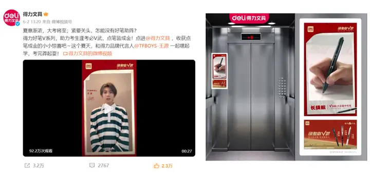 此次推广活动的“线上+线下”组合拳打法,通过双向发力,有效实现了全场景营销,以丰富多元的形式让这些优质产品走进消费者视野。在线上传播方面,得力通过微博、微信、抖音、小红书等主流社交平台的达人种草和数字物料投放,有效提升了产品热度。同时,优质青年偶像王源高考倒计时祝福,成功打造资源位引爆考试季话题。在线下活动方面,在南京、长沙、西安、济南、郑州等多个城市的电梯楼宇投放得力好笔病毒视频和广告,覆盖当地多个核心点位,并引流线下终端门店。同时V系列产品的试笔纸活动通过线下参与、线上抽奖的形式打造营销闭环,自然而流畅的线上线下营销联动为受众带来极强的参与感和体验感;而抖音头部达人的探店活动则进一步解码产品魅力,成功捕获校园学生党。