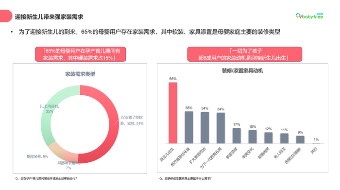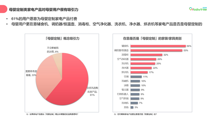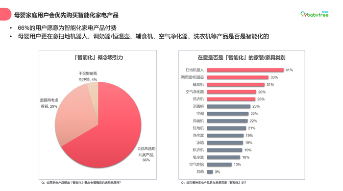 一个值得注意的趋势是,无论是家居产品还是家电产品,满足个性化需求的定制类产品及提高生活品质的智能化产品日渐受到青睐,展现出较强的吸引力。据报告数据,接近60%的用户愿意为母婴定制化、智能化的家居家电产品付费。