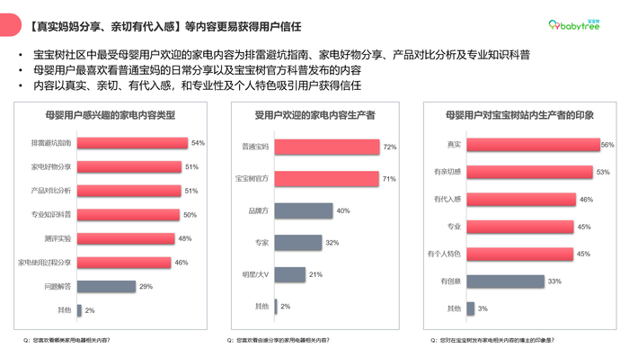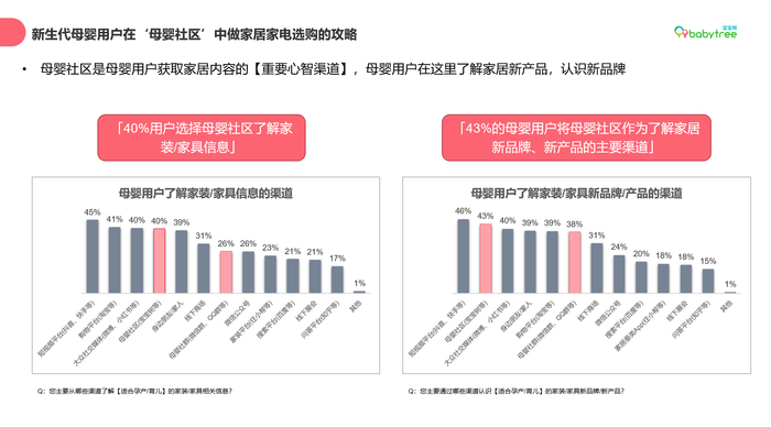 当前,新人群、新场景不断更迭,消费升级、需求细分同步加剧,家庭消费市场正在发生剧变;随着信息获取渠道的分化、流量碎片化,用户的消费购物的链路也在演变。《年轻家庭“理想生活家”洞察报告》指出,新生代母婴用户更倾向于在“母婴社区”中做家装攻略以及产品种草:以宝宝树社区为例,普通宝妈的真实使用感受、好物分享、避坑指南是家装用户最为“受用”的内容,官方的专业科普内容则能更细致入微迎合母婴用户难点与痛点,因而在新生代家庭的选购链路中,成为一个重要的心智渠道。