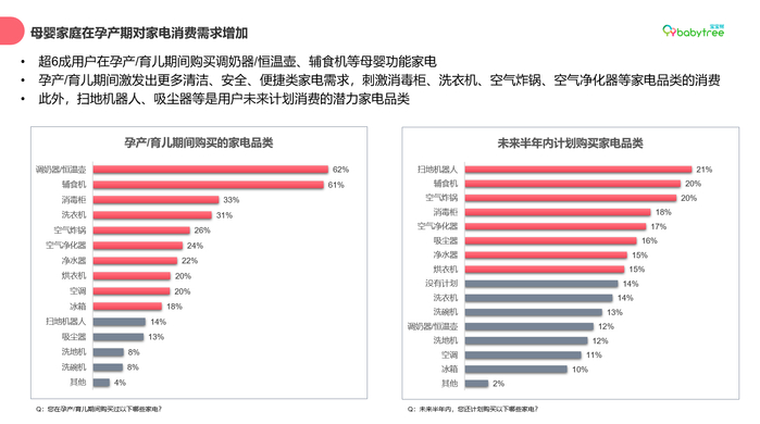 总的来看,随着新生代父母逐渐成为孕育群体主力,母婴市场消费升级趋势愈发明朗,年轻一代宝爸宝妈更愿意为品质买单,通过家居改造和添置家电解放双手,提高生活品质。定制化、健康化、智能化、精细化成为母婴消费市场的新趋势
