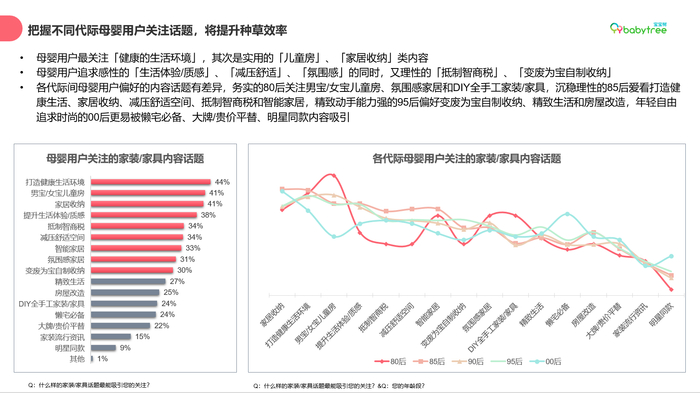 受成长环境影响,各代际间母婴用户消费理念不同,在话题内容偏好上呈现出明显差异:务实的80后更关注男宝/女宝儿童房、氛围感家居和DIY全手工家装/家具等;沉稳理性的85后则乐于了解家居收纳、减压舒适空间、智能家居等内容,对营销过度的智商税类产品表现十分抵触;处于中间的90后话题偏好暂不明显,但精致动手能力强的95后偏好变废为宝自制收纳、精致生活和房屋改造,年轻自由追求时尚的00后更易被懒宅必备、大牌/贵价平替、明星同款内容吸引。