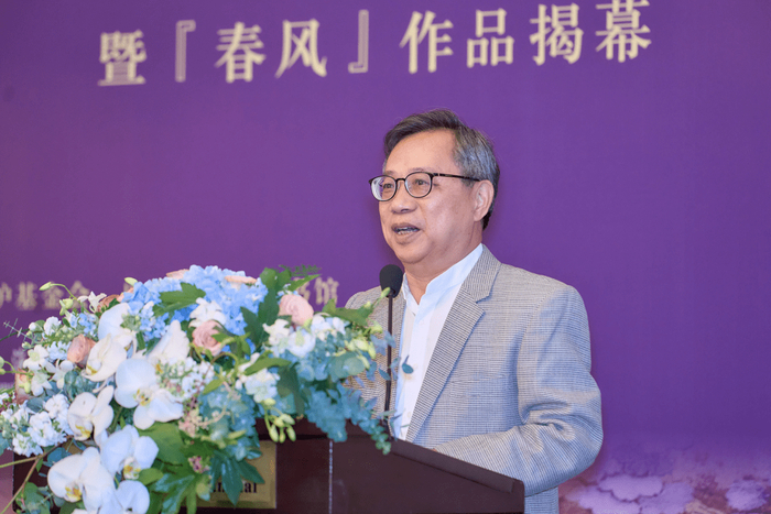 一件由人间国宝室濑和美先生创作于疫情期间的大型莳绘作品《春风》在活动中揭幕亮相,作品长3.3米,高1.5米,以莳绘技法描绘了一株600 多年树龄的垂樱,经历冰雪风霜,在一年年春风中依然生机勃发,手工艺术传递出人心的温暖和希望,揭示出生命力的顽强和茁壮,传导出大自然为我们带来的和谐与和平的启示。