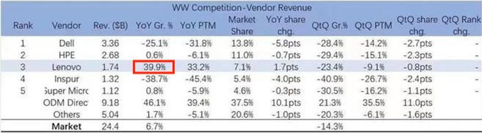 IDC报告显示,2023年第一季度全球x86服务器厂商收入同比增长6.7%至244亿美元,其中,联想集团连续三个季度位居全球前三,其也是唯一一家实现大幅增长的企业,39.9%的同比涨幅成为全球前五厂商中的最大亮点。全球排名前五的厂商中,在联想大增39.9%外,浪潮下降38.7%,戴尔下降25.1%,惠普(HPE)微涨0.6%,超微微涨0.8%。