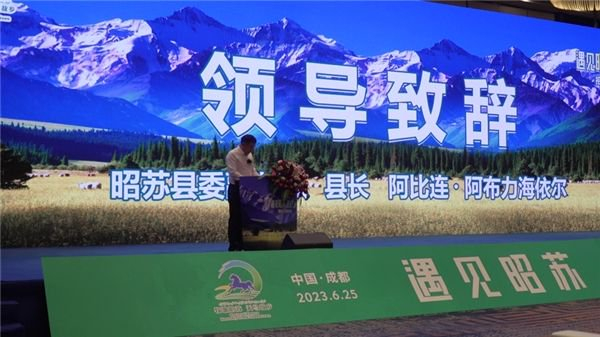 推介会上,昭苏县委副书记、县长阿比连·阿布力海依尔致欢迎词,向莅临本次推介会的各位来宾、各位企业家朋友和各界人士表示热烈的欢迎和衷心的感谢,并希望更多的企业家了解昭苏、走进昭苏、投资昭苏、兴业昭苏。昭苏将以最大热忱、最优服务、最高效率、最佳环境,与广大企业家朋友共享发展机遇,共同描绘美好蓝图,携手书写“遇见昭苏 遇见未来”的精彩华章!