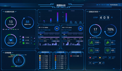 值得一提的是,清雷科技还提供智慧康养大屏和子女亲情共享服务。康养机构前台安装智慧康养大屏就可以实时显示社区内所有老人的生命体征情况、睡眠质量分析、活力指数、跌倒风险指数等数据。
