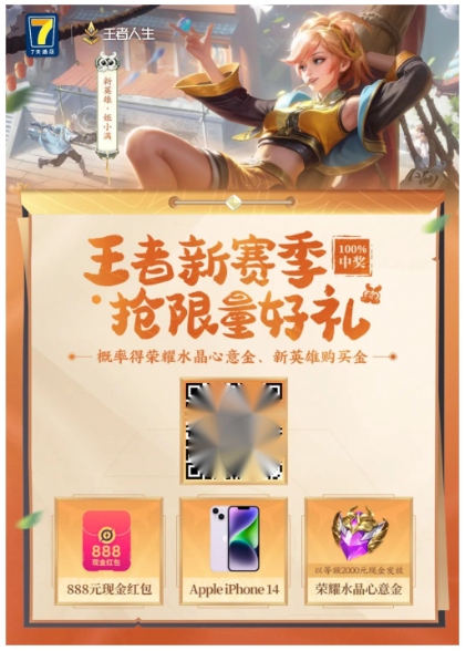 Apple iPhone 14(概率0.0001%)、荣耀水晶心意金(概率0.0005%)、888元现金红包(概率0.001%)、阿珂-节奏热浪(概率0.5%)、小乔-缤纷独角兽(概率0.5%)、娜可露露-晚萤(概率0.5%)、不知火舞-魅语(概率0.5%)、阿珂-暗夜猫娘1日限免卡*7(概率20%)、不知火舞英雄1日限免卡*7(概率20%)、宫本武藏-地狱之眼1日限免卡*7(概率20%)、海月英雄1日限免卡*7(概率20%)、铭文碎片*20(概率17.9984%);