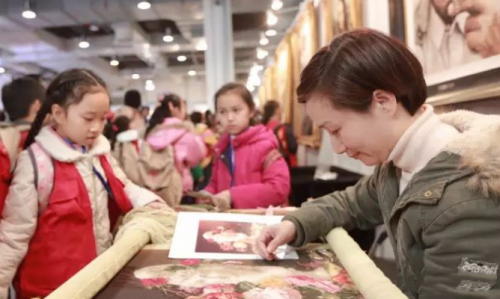 (孩子们参观学习高桥绒绣)