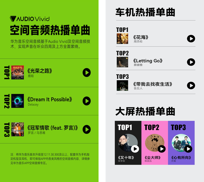 空间音频是华为音乐近一年重点发力的领域,从空间音频专区上线到首次“上车”,越来越多热门艺人的多曲风歌曲都陆续加入空间音频领域。鹿晗的《光荣之路》、Delacey的《Dream It Possible》、罗言/马思唯的《冠军情歌(feat.罗言》)纷纷上榜,这些歌曲基于Audio Vivid标准及空间音频技术,让更多丰富的音乐细节得以呈现,同时在耳机和汽车等不同终端设备上感受不同的空间感、层次感、流动感,为听众打开了一种崭新的沉浸式聆听体验。