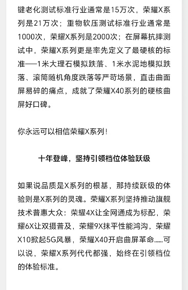 荣耀X50既然是荣耀X系列的十年登峰之作必然将会有很大的革新式升级,这一点荣耀中国区CMO姜海荣在“一封信”当中就已经提到:“荣耀X50,既是十年登峰之作,也是新十年的开篇之作。它将带来多项突破行业的品质新标准,实现行业开拓性创新,引领档位跃级体验”。