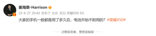 同时荣耀中国区姜海荣也在微博发出灵魂拷问,“大家的手机一般都是用了多久后,电池开始不耐用的?”这就是所谓的手机电池耐久度问题,指的是手机电池的保质期。目前手机电池一般使用寿命为3年左右,也就是在充放电循环400-500次左右,电池的衰变就会变快,用户直接使用感受就是电池越来越不经用,虽然100%满电的,但是刷五分钟抖音就掉了很多电。