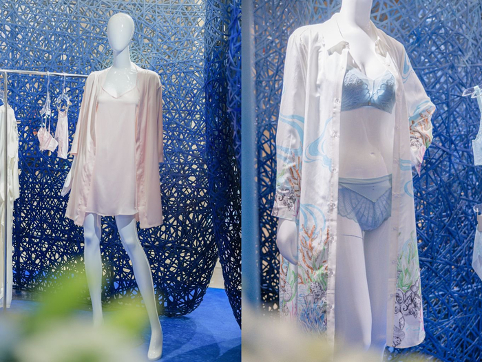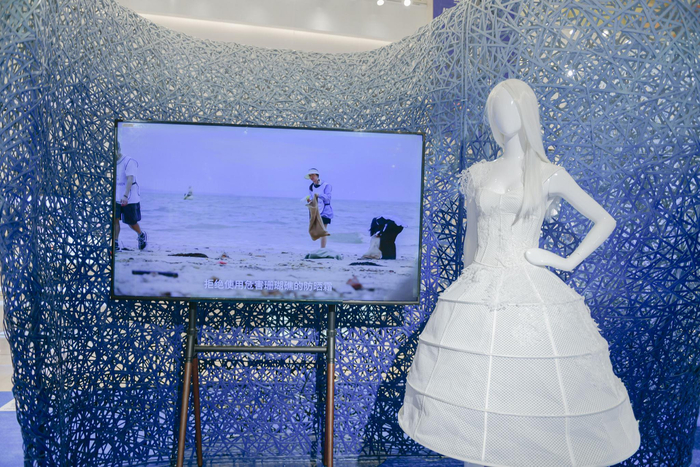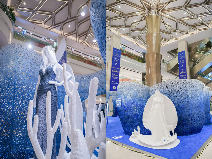 安莉芳内衣设计师所制作的艺术礼服作品身着在3D打印的的艺术装置中,胸口珊瑚、海浪造型仿佛美人鱼一般遨游在一片蔚蓝之海,别具一格。通过打造这样一个梦幻海洋空间,安莉芳希望唤醒更多人的环保意识,关爱和守护自然,共同参与到绿色减碳的生活方式中去,为清洁美丽海洋和环境出一份力。