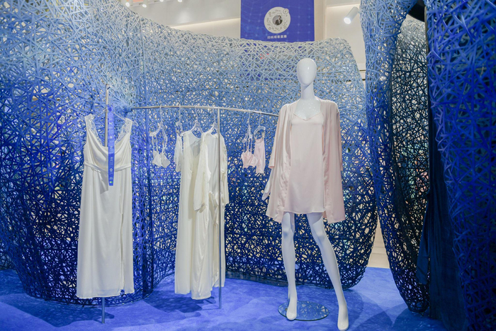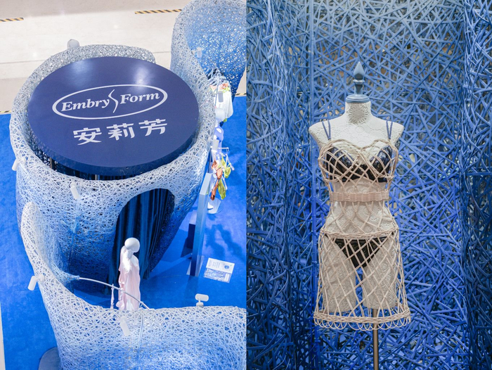 本次“海洋之旅”空间艺术展是由非遗传人杨隆梅制作的竹编作品,耗时1500小时、使用近五万根藤条编织而成。竹编作为古老而传统的民间技艺有着悠久的历史,在几千年的漫长岁月里,一代又一代匠人们通过勤劳的双手编织着自己的幸福和梦想,如同安莉芳一针一线缝纫而成的内衣,想让每一位女性都身着舒适和美丽。如今,这门古老的技艺也正在创新的路上走出不一样的风采,此次打造的蔚蓝海洋艺术空间无疑令人眼前一亮。以蓝色为主色调的海洋之旅让人沉浸其中,以海浪环绕的花瓣路径,感受每个优雅环保展区。