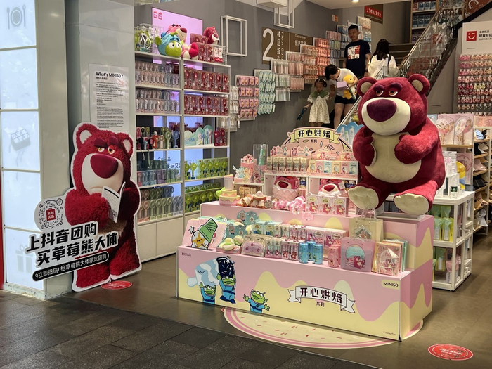 在本次「购物狂欢季」,名创优品也强势输出了一波潮流化的IP“种草”,借助草莓熊与抖音生活服务开启联名营销,2万个限量版草莓熊大体专供,顾客仅可通过抖音购买专属产品代金券。同时贴合年轻人喜好,名创优品还邀请明星助阵,618期间联合张子枫、吴卓羲等转发草莓熊物料宣传,与粉丝进行个性化精准沟通,在满足他们喜好刺激消费的同时,更增强了品牌与消费者的情感粘合度。