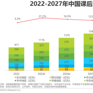 2021 年 7 月,随着双减政策落地,课后服务进入 2.0阶段,政策针对课后服务内容的多元化 、社会资源的利用等方面提出进一步的要求,保障提效成为目前我国课后服务领域的发展重点 。艾瑞咨询预测,2023 年国内课后服务的市场规模将达1176 亿。从地区分布来看,华东和华南地区由于财政扶持力度较大,家长付费意愿和能力更强,占据全国前二位 。