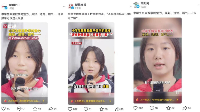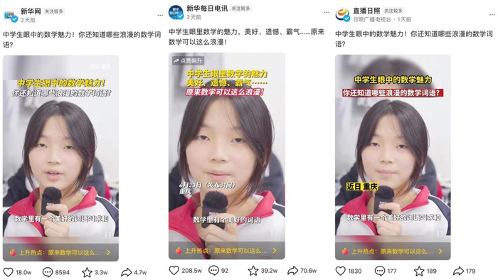 近日,一则关于数学学科的视频吸引社会多方关注,新华网、新华每日电讯等官方媒体接连报道,瞬间荣升网络热搜第一。之所以该视频火上热搜,在于被定义为枯燥乏味学科的数学,在这群初中生眼里却迸发“另类”解释,在他们眼里,数学不再局限于晦涩难懂,而是有着更为深层次理解的教学科目。