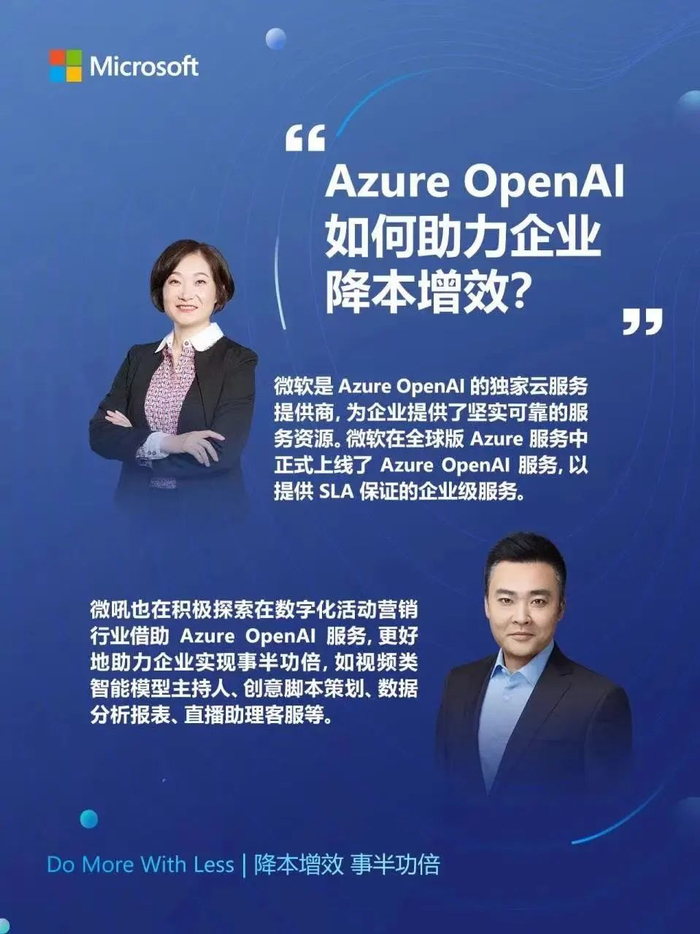 段微之:Azure OpenAI助力企业降本增效、事半功倍众所周知,微软是OpenAI的独家云服务提供商,通过全球领先的大规模高性能云计算资源,微软Azure为OpenAI提供了可靠的资源支持。与此同时,微软Azure也正式推出了Azure OpenAI服务,为企业级客户提供具备SLA保证的高级服务,帮助更多企业充分发掘大规模智能模型与商业落地场景相结合的巨大潜力。