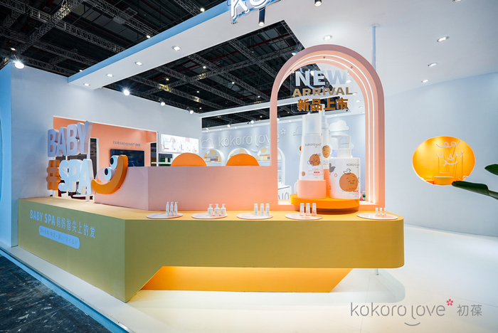 今年,kokoro love初葆以100+平米超大展位让人耳目一新。橙、黄、白为主色基调,日系小清新的布局,展示柜中简约却不简单的高颜值产品,凸显清新、治愈的儿童洗护品牌形象,传递天然、纯净、健康的护肤理念。在整个6.2馆一众母婴护肤、日化品牌中脱颖而出,尤为亮眼,吸引了众多观众驻足了解,寻求合作共赢的机会。
