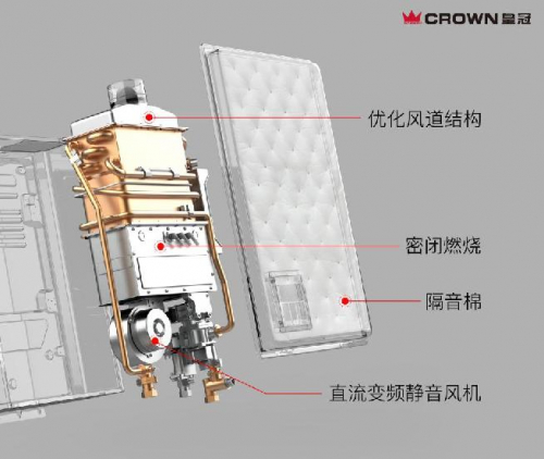城市人员居住密集,房价偏高,大部分房子面积都不大,热水器使用过程中,噪音不能过大,皇冠热水器采用直流变频静音风机,优化风道结构,在产生噪音的共震点添加隔音棉,从源头减震降噪,最大程度的把噪音降到了最低点。