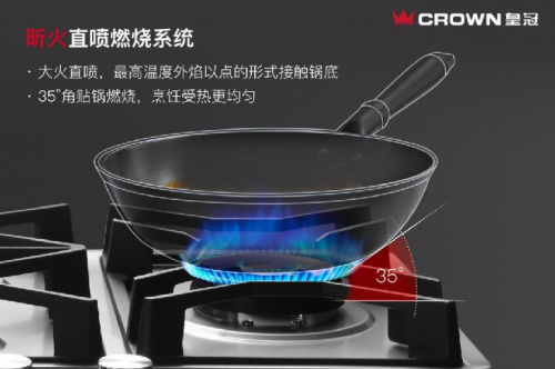 35度角直孔出火,其目的是让火苗沿着圆底锅倾角往上蔓延,可以大面积覆盖锅底,同样的火力实现了更高的热效率,满足了用户猛火爆炒的需求;