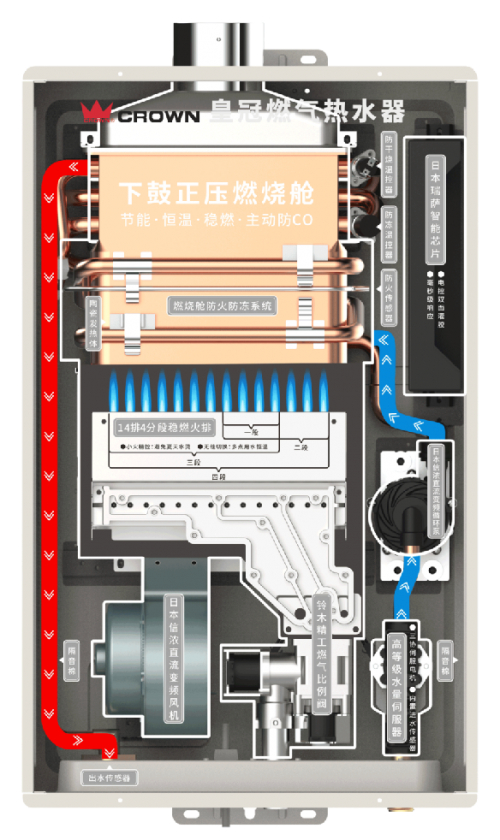 与常规的热水器的2分段、3分段燃烧不同,皇冠采用14排火排组成的4分段燃烧,形成了皇冠燃热特有的“极火技术”(小火够小,大火够猛),解决了夏天高温导致热水器进水温度过高,出水过烫的难题。