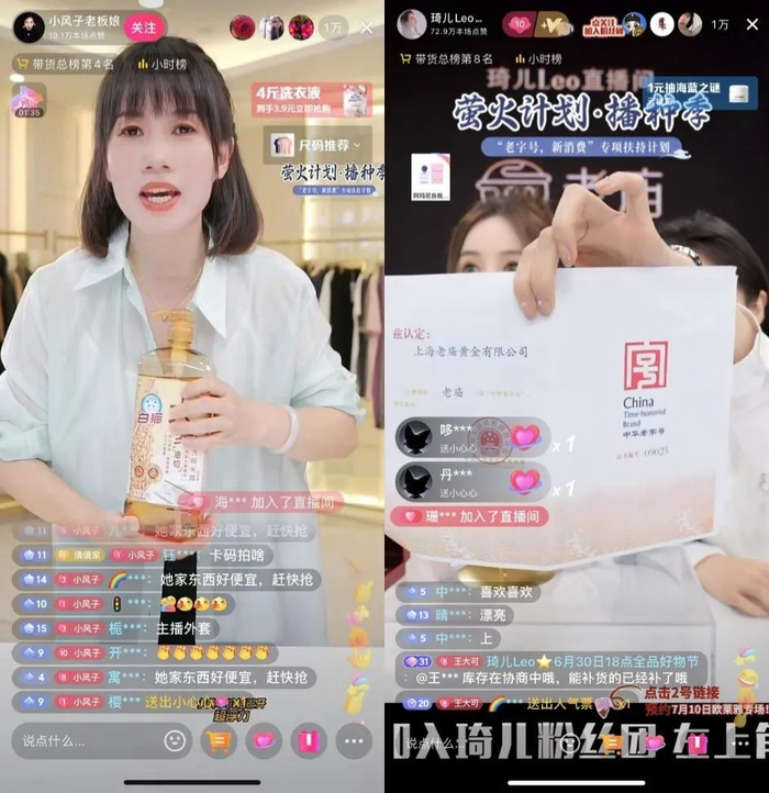 抖音电商创作者@小风子老板娘、@琦儿Leo 带货老字号品牌产品