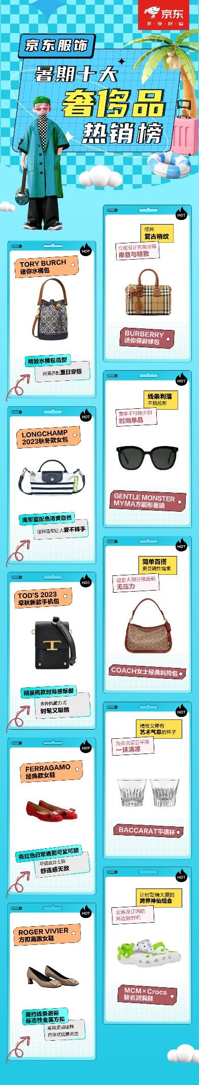 由于兼具高品质和高颜值,奢品服饰、奢品箱包等向来是京东的热销品类之一。此次京东奢品暑期十大热销榜单中,便涵盖了箱包、鞋履、服饰等多品类爆款。在背包的选择上,消费者越来越倾向个性多元的造型,TORY BURCH水桶包、BURBERRY保龄球包、LONGCHAMP手拿包、TOD'S手机包、COACH腋下包等登上热销榜单,满足通勤、聚会、休闲运动等多场景需求;在洞洞鞋火遍大街小巷时,MCM×Crocs联名系列洞洞鞋凭借趣味图案和多巴胺配色登上榜单。此外,还有ROGER VIVIER方扣漆皮鞋、菲拉格慕芭蕾平底鞋、GENTLE MONSTER太阳镜、Baccarat皇冠平底杯、BOSS男士Polo衫等奢品中的热销款,搭配穿着让夏日出行Look更有层次感。