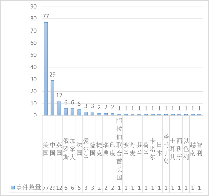 可进行详细分析的数据泄露事件共182件,泄露数据总量为447,725MB,涉及到的国家共24个。