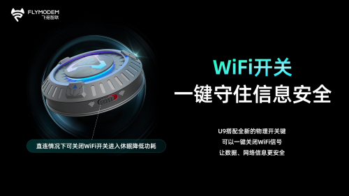 飞猫智联U9采用全新的物理开关键,该开关键使得一键关闭WiFi信号成为可能。通过按下这个物理开关键,用户可以快速关闭WiFi信号,将数据和网络信息更加安全地保护起来。这一功能非常有用,尤其在公共场所或不可信网络环境下使用时,您可以轻松控制和保护您的网络连接。在直连情况下,飞猫智联4g随身WiFi U9还可以通过WiFi开关关闭共享WiFi,降低功耗。