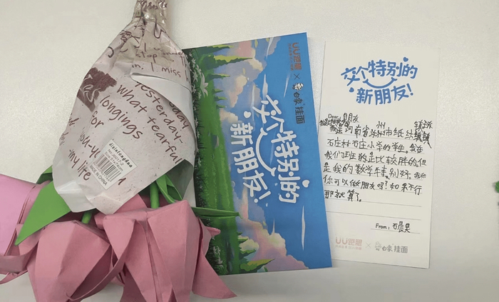 “没想到做公益还可以收到小朋友们的回信,太暖了吧!”“这个小朋友太可爱了!你快看给我的回信……!”稚嫩的字体,温暖的话语,一封封小朋友们针对近日白象挂面携手UU跑腿举办的“交个特别的新朋友”公益活动的回信,穿过山野,来到城市,寄送到了每一位爱心捐赠者的手中。