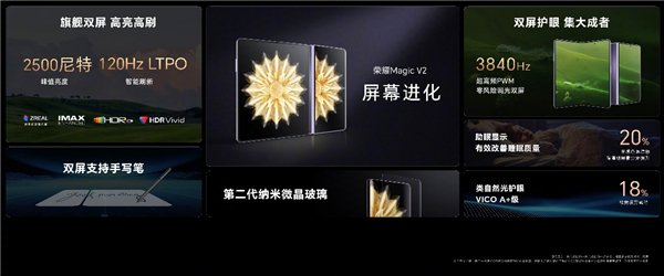 在屏幕方面,荣耀Magic V2采用在折叠屏手机中十分少见的“内外双旗舰”方案。参数上,内外两块屏幕屏占比均超过90%,双屏均具备120Hz刷新率以及LTPO技术,同步支持3840Hz零风险调光,拥有10.7亿丰富色彩,也通过了“IMAX认证”。