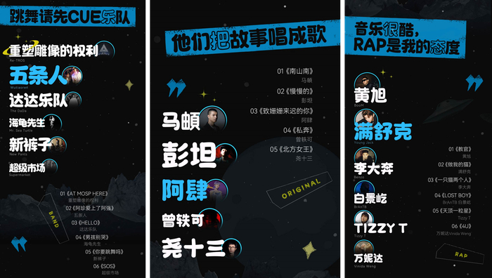 如果你喜欢有故事的歌手,那么在摩登天空的派对上,不容错过的还有马頔、彭坦、阿肆、曾轶可、尧十三等,无论是民谣、OST、还是流行,他们把故事写进自己的原创歌曲里娓娓道来,在不同的时刻悄然走入听众的内心,陪伴着大家去经历生活种种。
