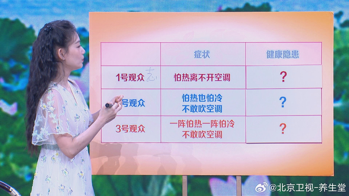 今天做客《养生堂》的专家近期发现,在三伏天里的门诊中,有一类患者会猛增,这类患者有个特点,普遍都爱和空调较劲。有些人和空调较劲,是因为总觉得空调不够凉。还有些人和空调较劲,是因为一会嫌屋里热,一会嫌屋里冷。还有些人既怕热也怕冷,总是找不到舒适的温度。其实这几种爱和空调较劲的人,体内都有不同程度的健康问题。三伏天里您也总爱和空调较劲吗?7月20日17:25,国医大师,东城中医医院特聘专家王庆国做客北京卫视《养生堂》节目,用中医的妙法帮您轻松过夏天。