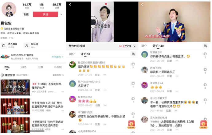 除直播外,费包包还在西瓜视频用短视频的方式表演怀旧歌曲。他的第一条作品发布于2019年6月。画面中,一身粉色西服的费包包微微仰头,用“费式唱法”演唱了一首粤语歌曲《偏偏喜欢你》。在此后的4年里,费包包在西瓜视频累计发布作品300余条,吸引粉丝超66万人,获赞58.3万。