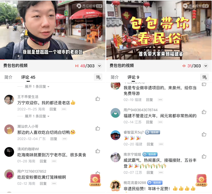 除模仿费玉清外,费包包还在西瓜视频中化身为vlog创作者,通过镜头向网友宣传各地的美食和文化。如今年春节期间,他带大家去到自己的家乡福建罗源,为网友们展示了当地“三代祖师”迎神过火这一传统非遗民俗;在海南万宁参加活动时,他则化身美食博主,将当地的烤乳猪、后安粉等特色美食推荐给天南地北的网友。