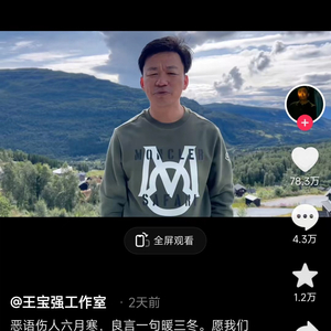 “恶语伤人六月寒,良言一句暖三冬”,王宝强在“反网暴倡议”视频中呼吁网友“不要为了找存在感,而去当‘键盘侠’,毁掉一个人,”“希望每一个人都能活的坦荡,给别人以微笑和拥抱,就会发现这个世界的美好。”该条视频发布后迅速登上抖音热榜,截至7月29日下午16时,获得了超78万网友点赞,并还在迅速增长。网友留言“没毛病”“说的太对了”“网暴多是在发泄情绪,有几个为别人着想?”