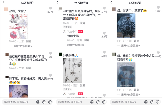 每个视频的评论区都有几千至十几万条留言,大部分都是用户在描绘自己喜欢的伞,求同样审美的小伙伴将自己热度给顶上去,有人甚至附上图纸“在线许愿”,希望雷鹏琳看到后能推出他们想象中的伞。