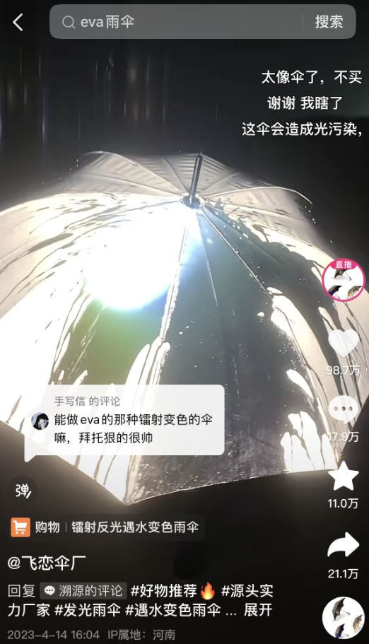 尤其是那把会反光的伞。这把被同行视为“卖不出去”的伞,在抖音电商上一炮而红,相关视频获赞150多万,上架3个月售出近2万把。